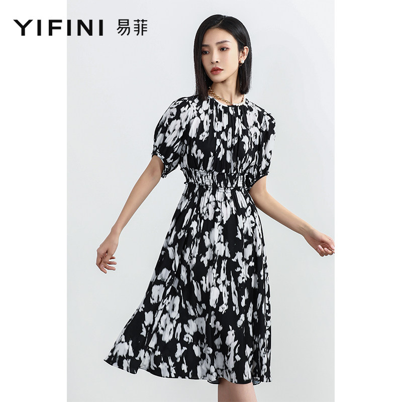 Yifini/易菲黑白印花圆领高腰显瘦短袖中长款连衣裙女夏装新款