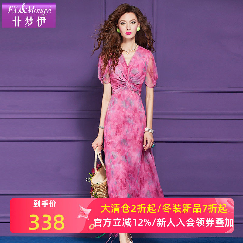 菲梦伊原创印花连衣裙女短袖夏装年轻款高腰钉珠褶皱显瘦V领长裙