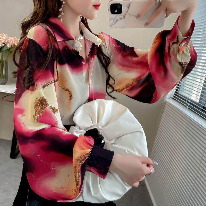 宽松印花雪纺衫女2024春秋新款上衣翻领灯笼袖衬衫女洋气衬衣女潮