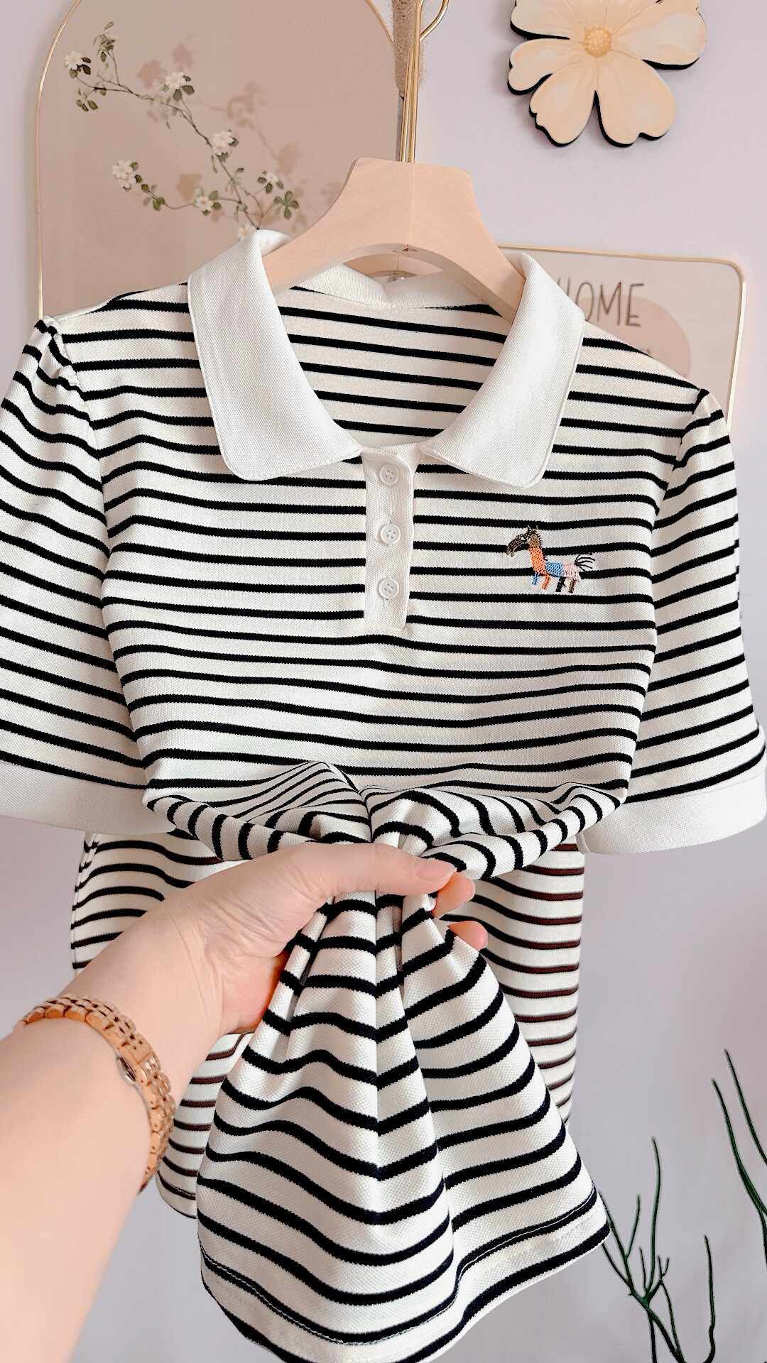 夏款韩版通勤遮肉横条纹POLO领卡通刺绣短袖上衣T恤衬衫衬衣女潮