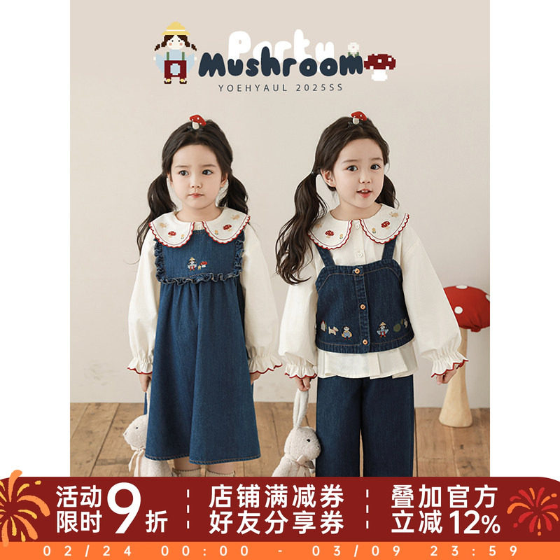 幼悠 女童2026春秋套装儿童草莓刺绣娃娃翻领衬衫A字裙摆背带裙潮
