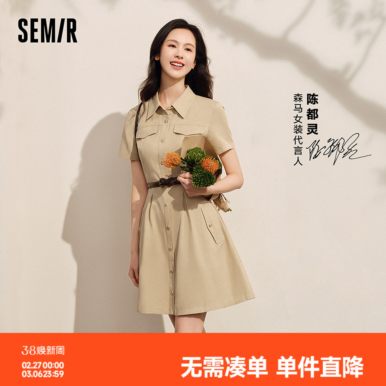 森马连衣裙女收腰衬衫裙复古休闲潮流百搭夏季美拉德纯色短裙气质