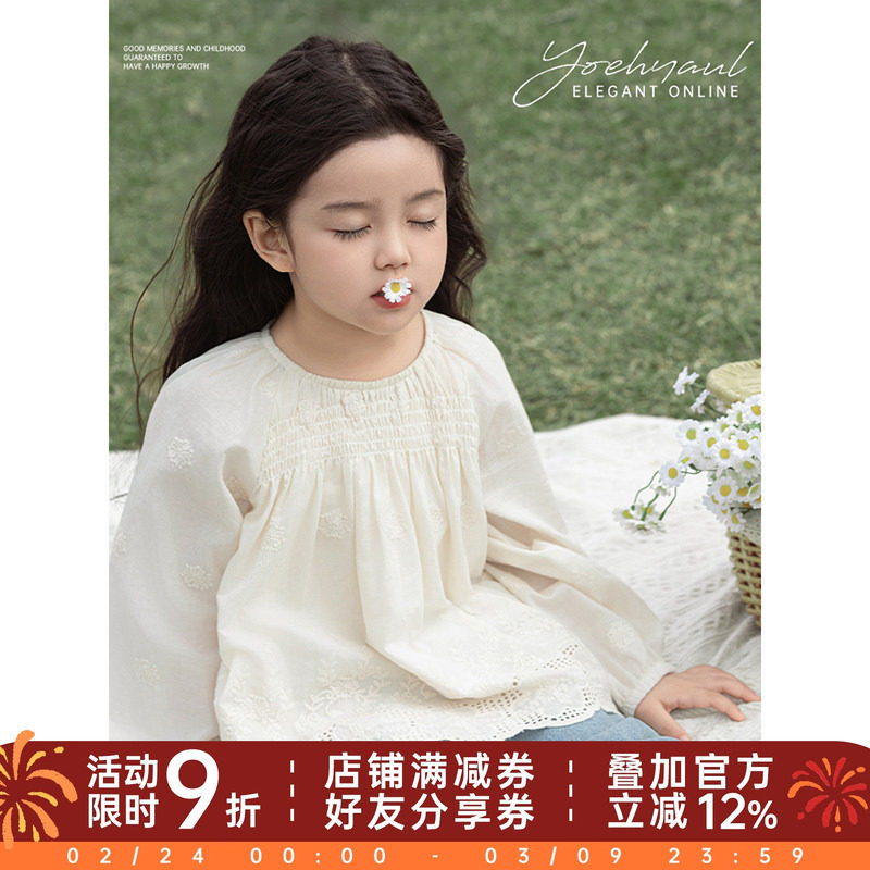 幼悠女童2026春季新款长袖翻领花边碎花衬衫宽松插肩袖儿童上衣潮