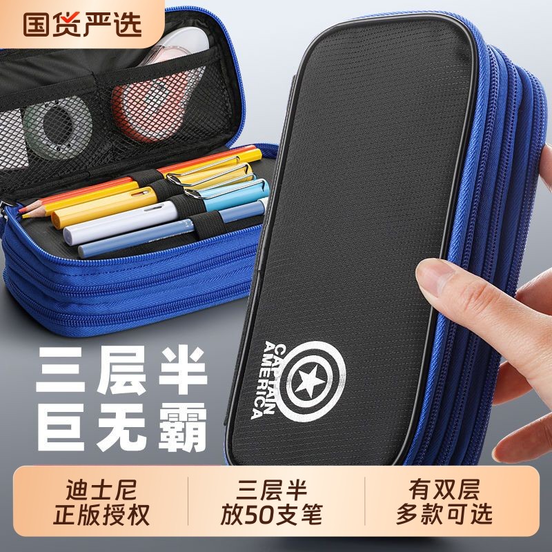 迪士尼笔袋大容量文具袋文具盒初中生铅笔袋韩版笔袋三层分隔儿童笔袋高中生铅笔盒男孩帆布笔袋蜘蛛侠美队