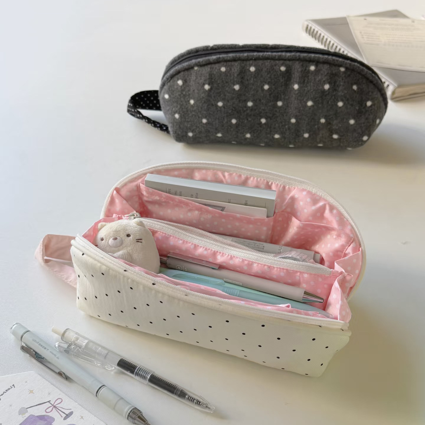 韩版波点贝壳手提式笔袋女生ins小众风高颜值大容量多隔层文具袋