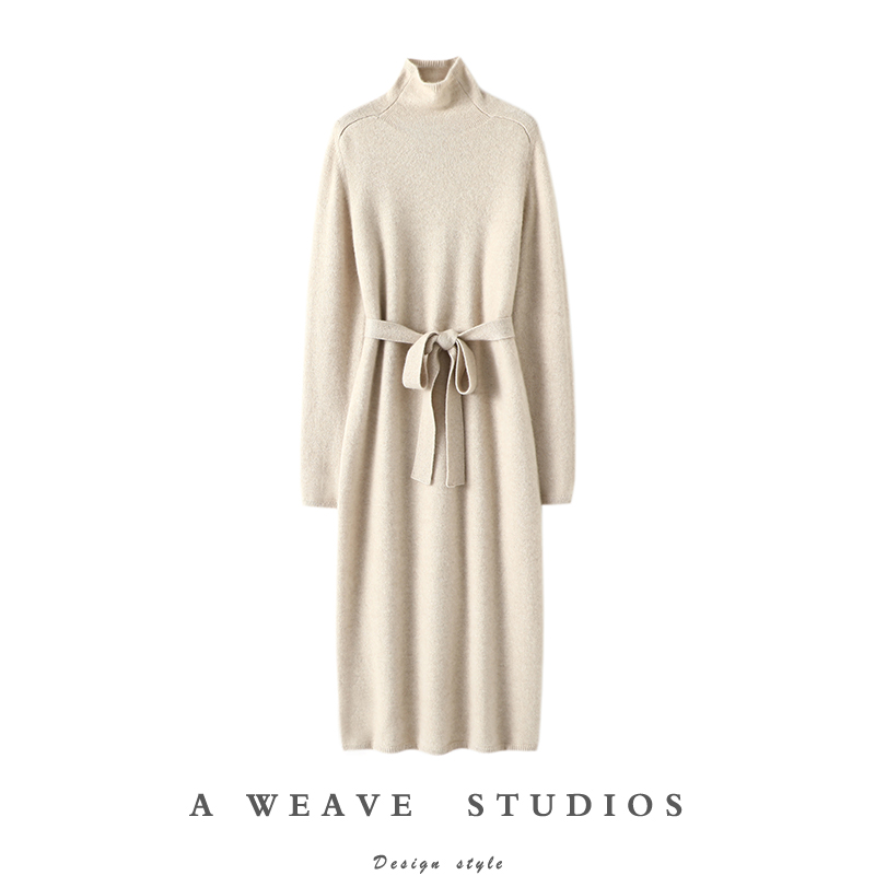 时尚的简约!系带加厚高领羊绒衫女长款连衣裙纯羊绒毛衣针织裙子