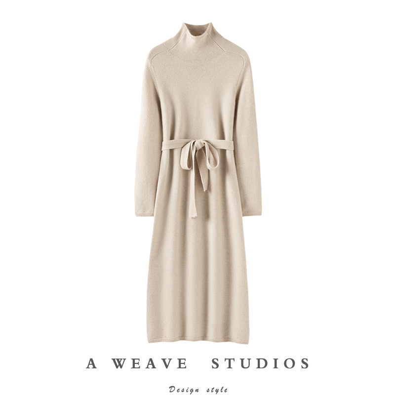气质狂加分!系带加厚高领羊绒衫女长款连衣裙纯羊绒毛衣针织裙子