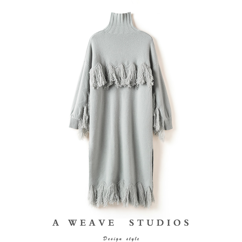 女王战袍!满满的都是气场!大克重流苏高领羊绒衫女长款连衣裙子