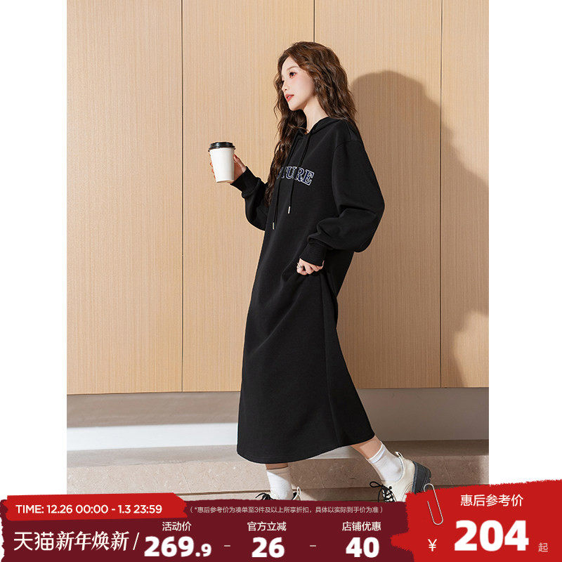唐狮连帽加绒卫衣裙女长款连衣裙秋冬款宽松长袖针织裙黑色裙子y1