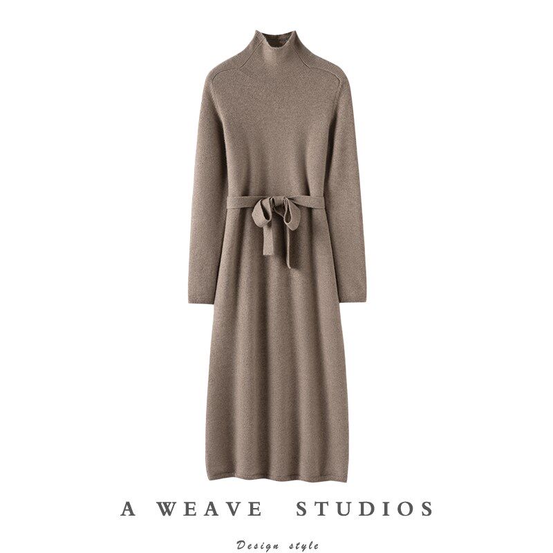 秋冬通勤王!系带加厚高领羊绒衫女长款连衣裙纯羊绒毛衣针织裙子