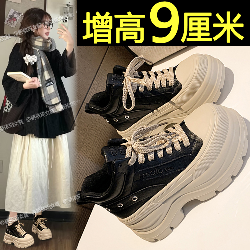 9cm内增高女鞋2025新款春秋季百搭松糕鞋厚底黑色高帮鞋运动板鞋