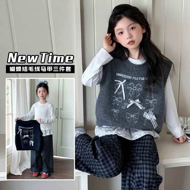 女童韩国套装秋季2025新款女孩大童马甲打底衫儿童装超好看格子裤