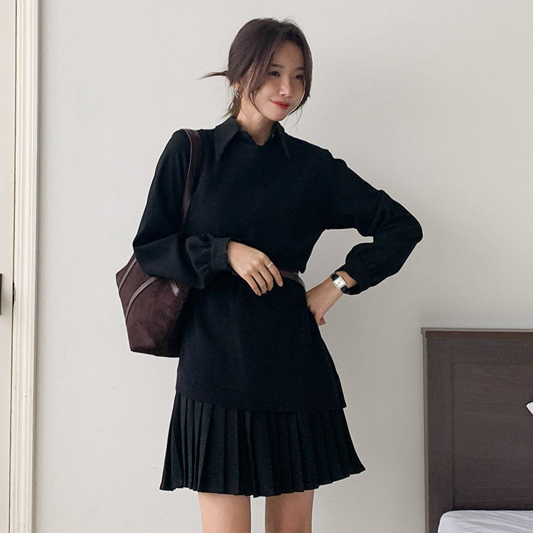 时尚起义韩国套装潮范2025冬百褶衬衫连衣裙+针织背心dp25111603