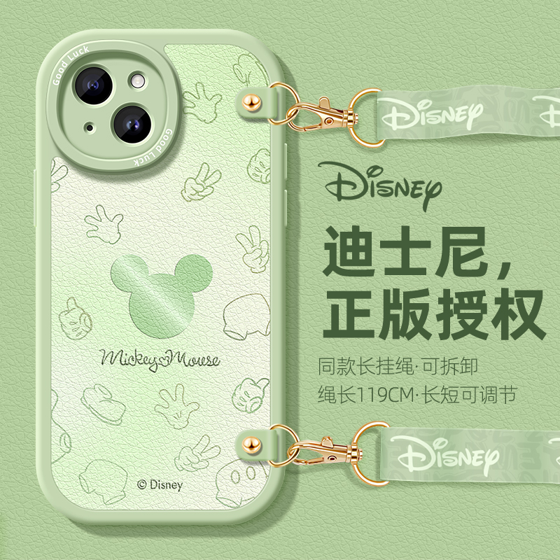 迪士尼适用苹果15手机壳iphone14正版13腕带12挂脖11pro防摔卡通xsmax硅胶8米奇全包xr斜挎挂绳6s女款7保护套
