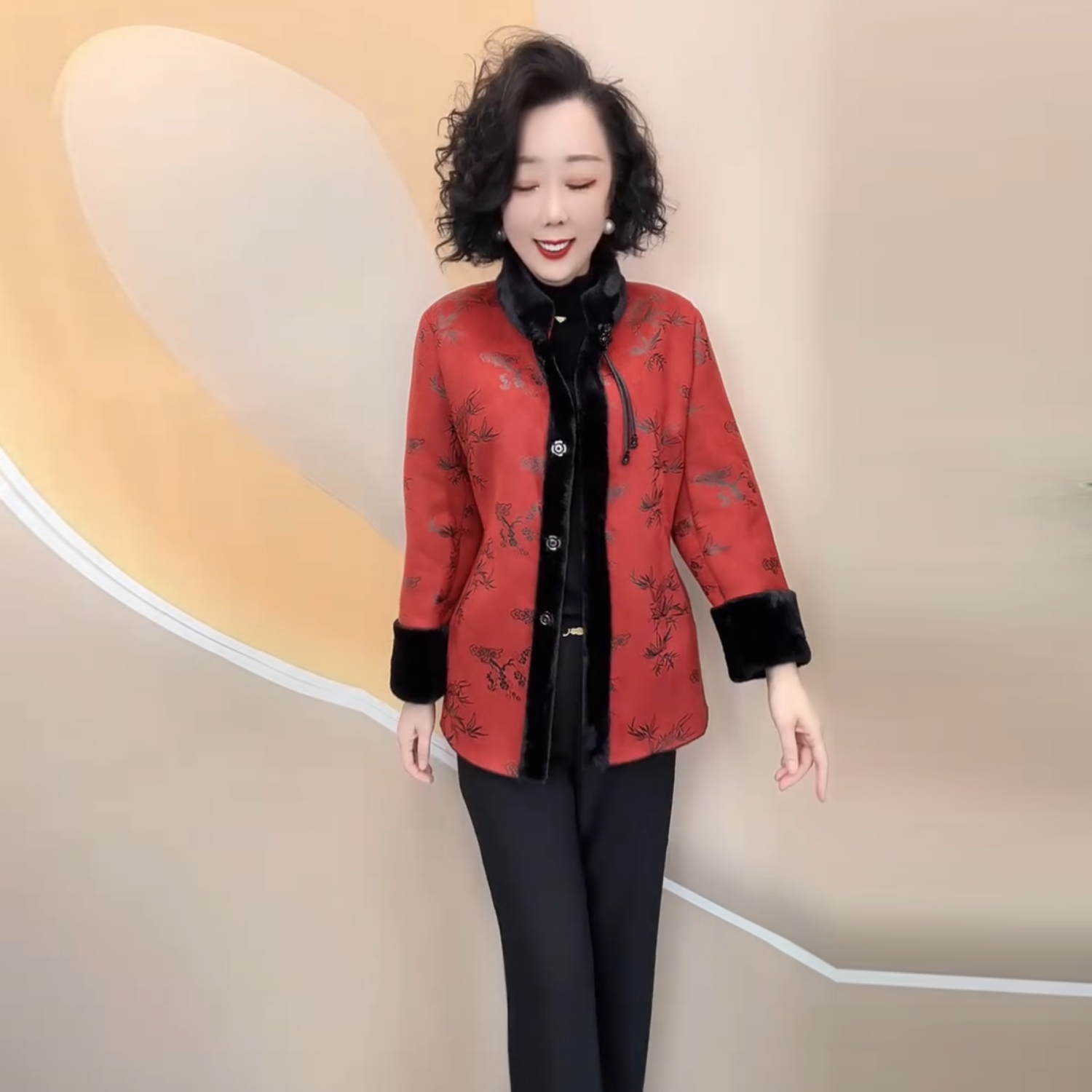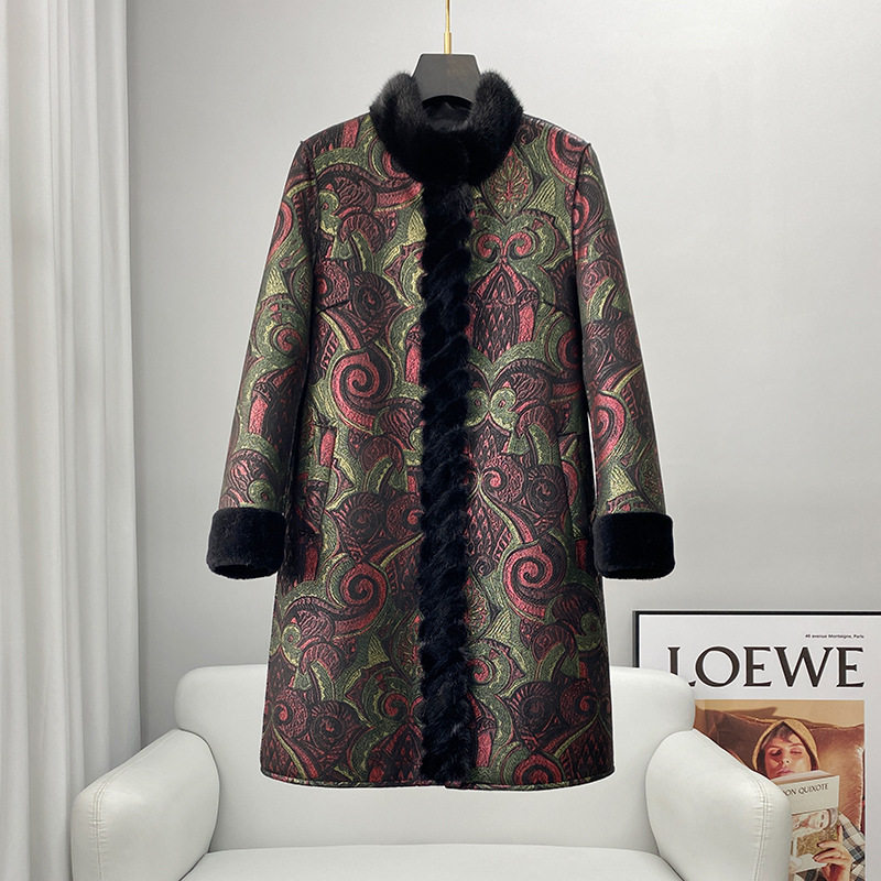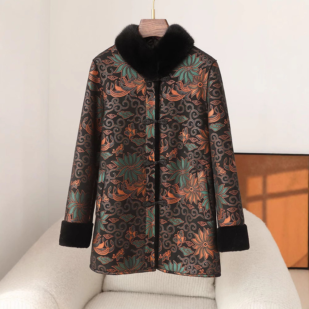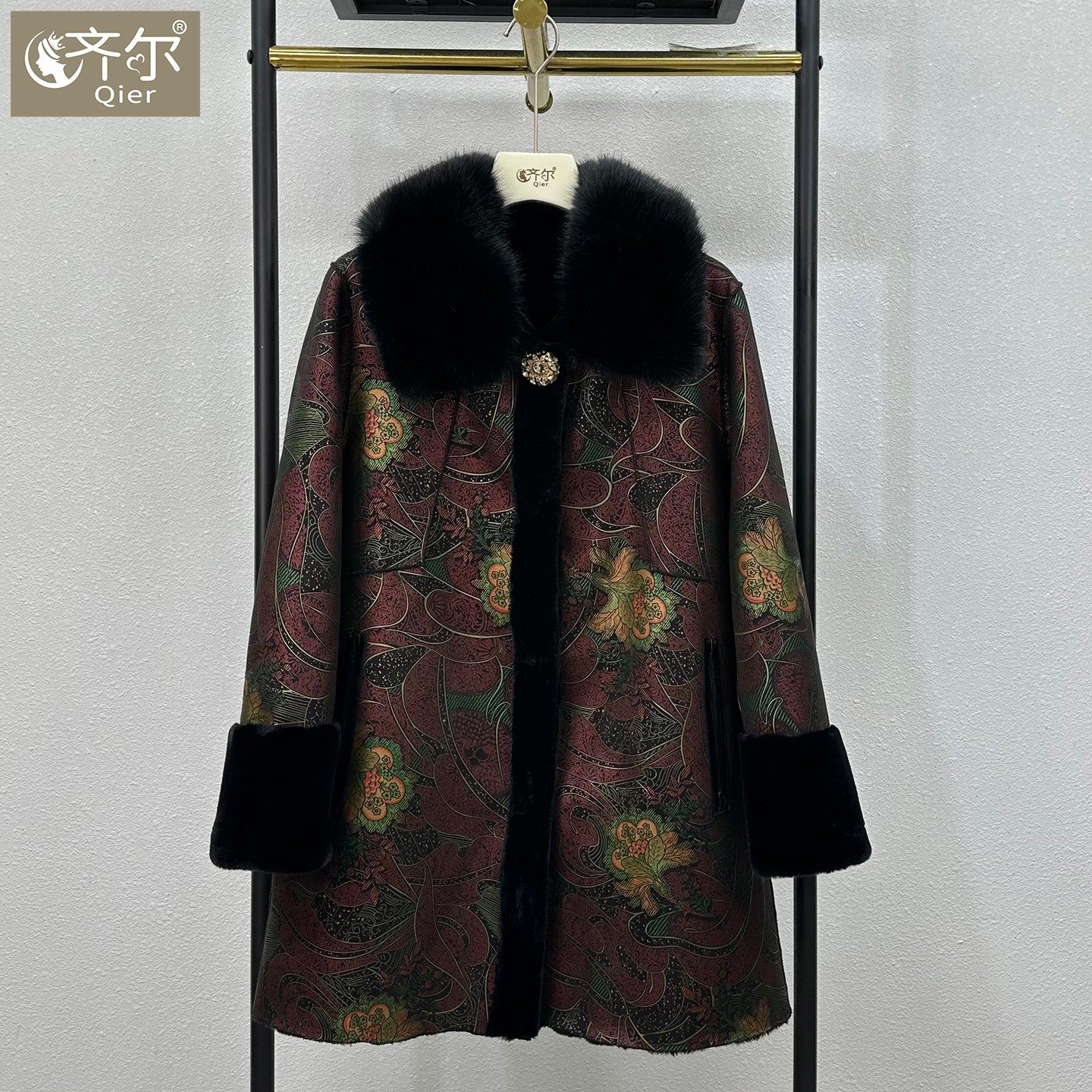 小个子妈妈国风皮草外套双面穿中老年印花皮毛一体羊剪绒保暖大衣