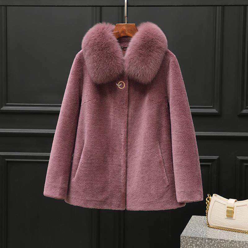 极速颗粒羊剪绒大衣女中老年妈妈短款狐狸毛领皮毛一体羊毛皮草外