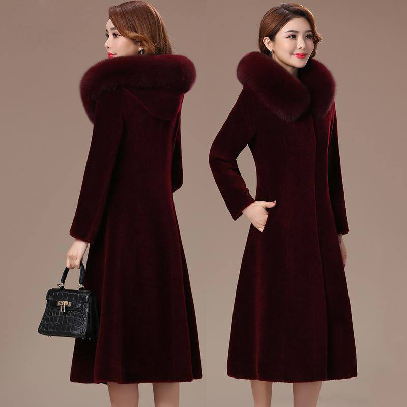 海宁冬季中老年羊剪绒大衣妈妈皮草外套女中长款狐狸毛领皮毛一体