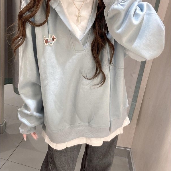 vintage国潮浅蓝色假两件连帽卫衣女学院风休闲百搭外套chic上衣