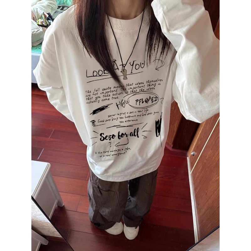 美式潮牌白色长袖t恤女纯棉秋季2023新款宽松百搭港风chic上衣服