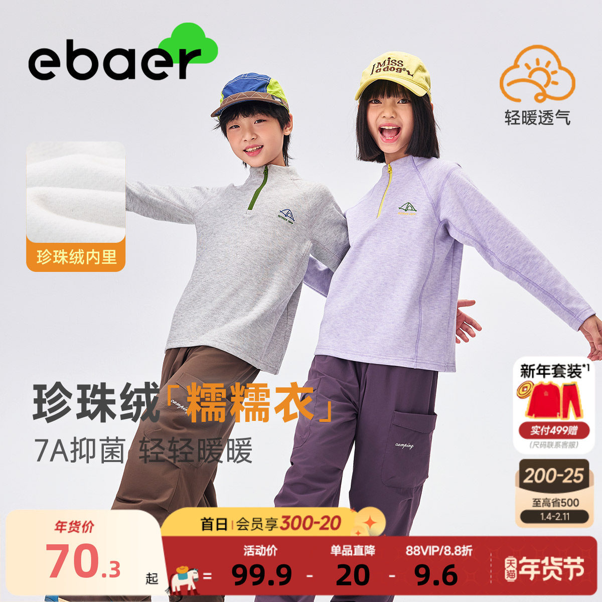 【糯糯轻暖衣】EBAER儿童运动上衣2025秋冬新款男女童加绒打底衫