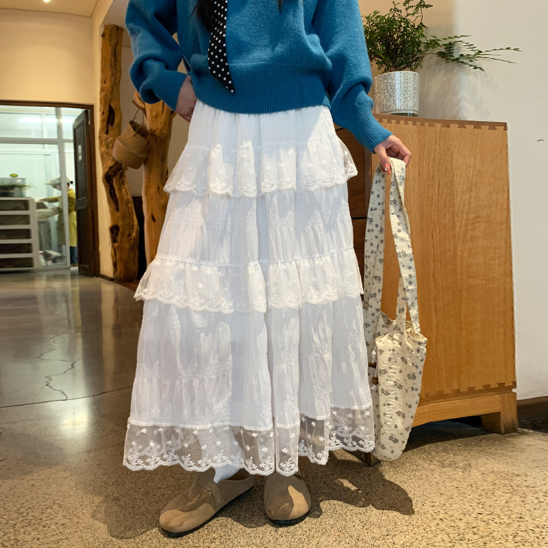 白色蕾丝蛋糕裙女春秋高腰显瘦宽松中长款a字芭蕾风蓬蓬半身裙子