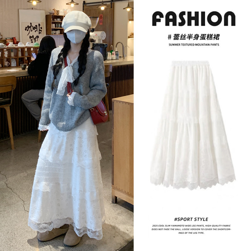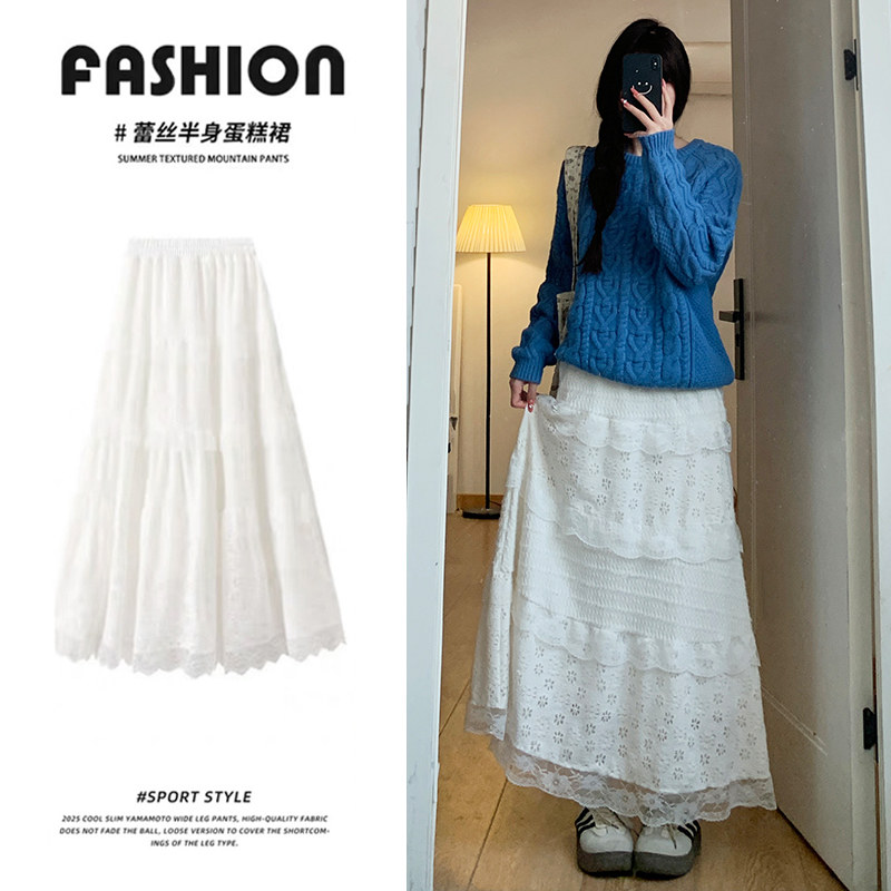 白色蕾丝蛋糕裙女春秋2026新款仙女风半身裙高腰中长款花边大摆裙