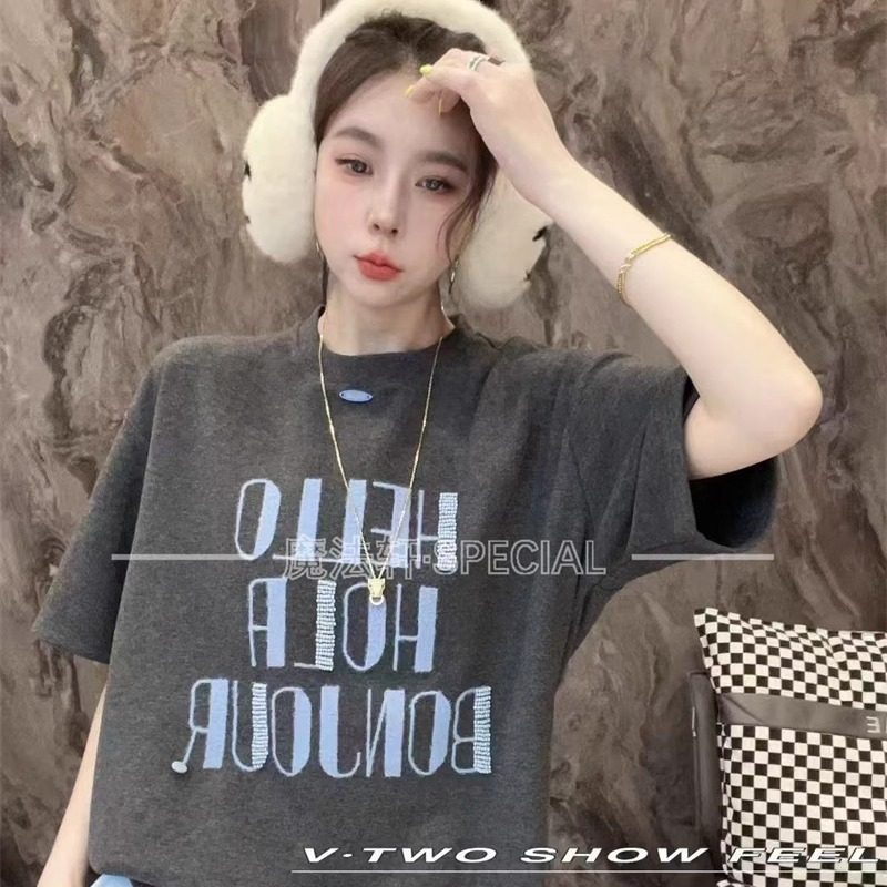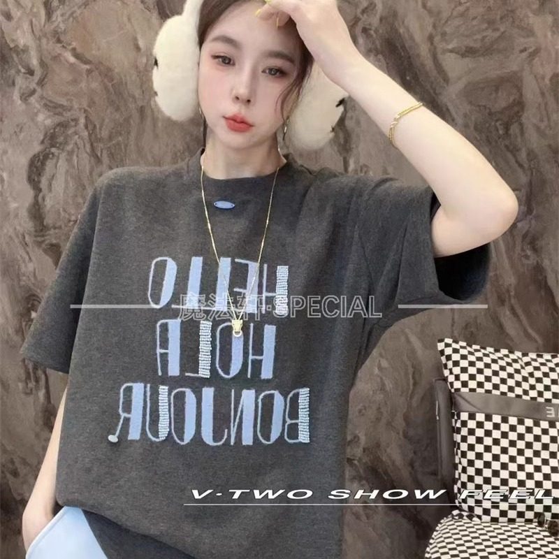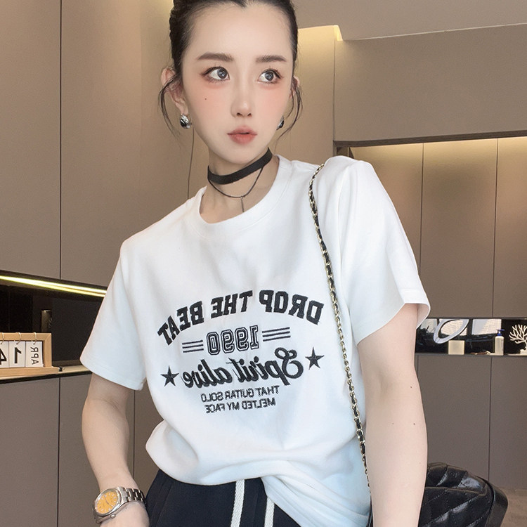 短袖T恤女2025新款字母刺绣圆领套头半袖上衣打底衫欧洲站冬季潮q
