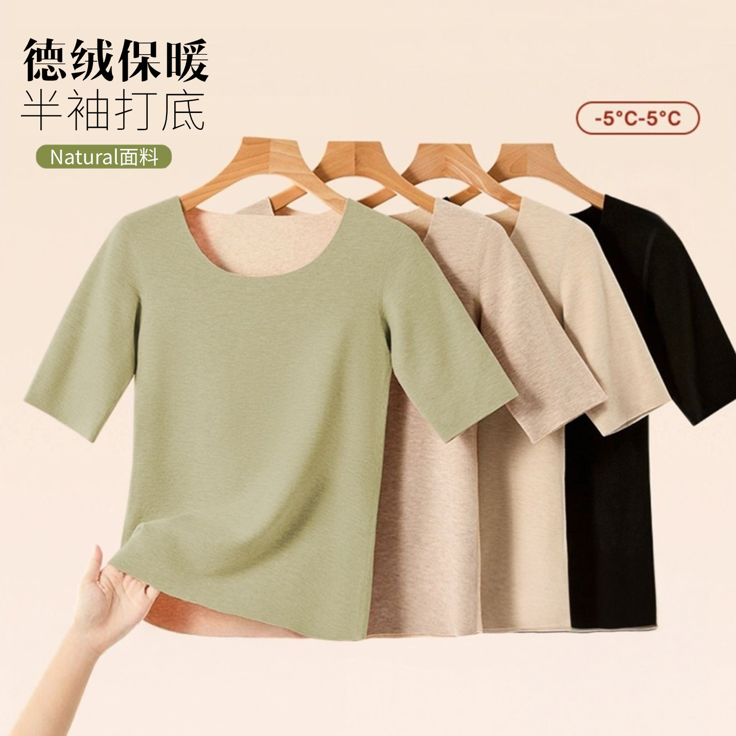 德绒短袖半袖保暖内衣t恤女2025新款上衣内搭冬季加绒中袖打底衫