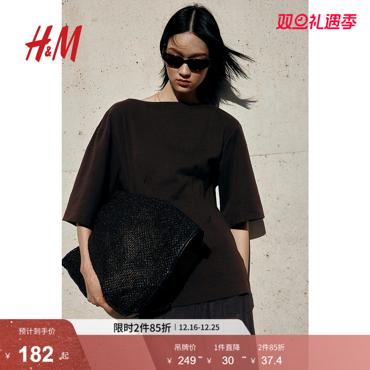 HM女装T恤2025年冬季新款一字领收腰上衣宽松半袖打底衫1274577