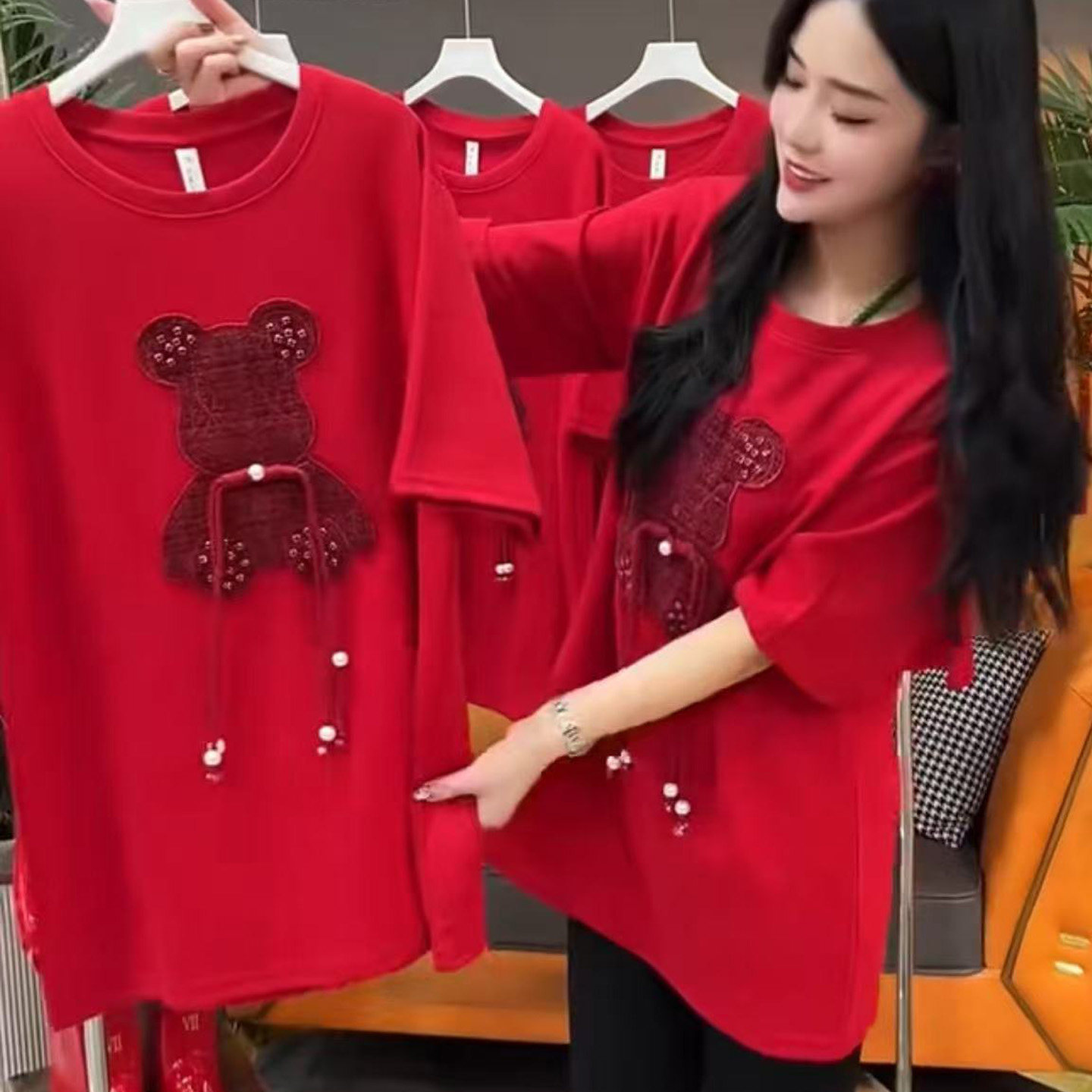 冬季加厚短袖打底衫女内搭可外穿红色半袖T恤遮屁股独特漂亮上衣