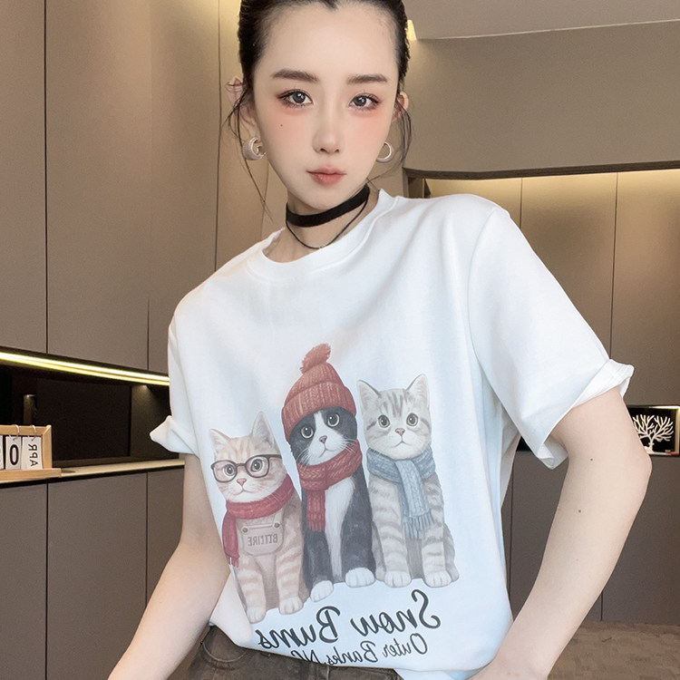 短袖T恤女2025冬季新款拼接卡通小猫印花圆领套头打底衫半袖上衣