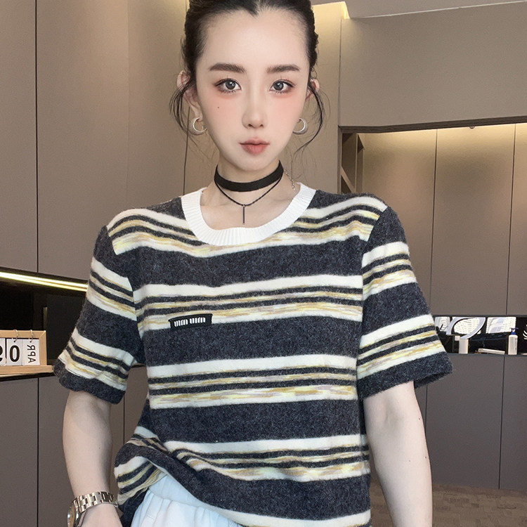短袖条纹T恤女2025冬季新款时尚撞色拼接圆领套头打底衫半袖上衣