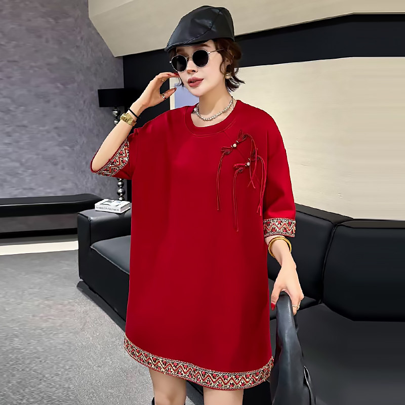 新中式盘扣国风半袖上衣打底衫胖mm2025冬季新款宽松大码显瘦女装