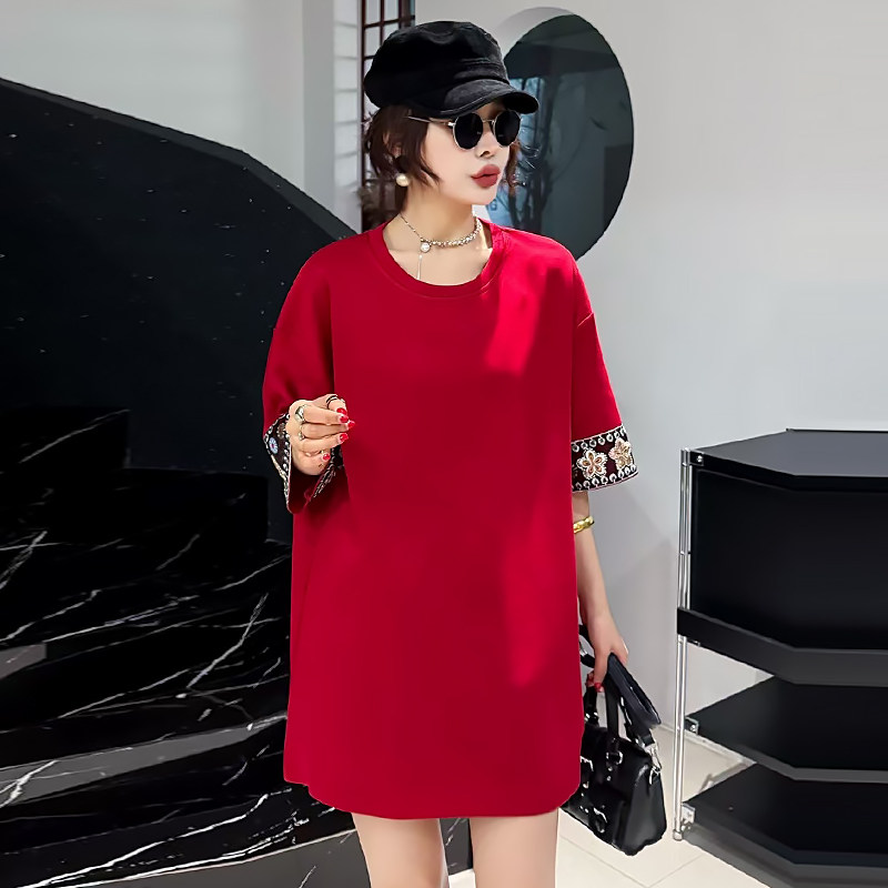 大码刺绣花朵半袖打底衫休闲上衣胖mm2025冬季新款宽松显瘦女装潮