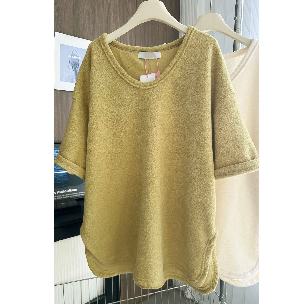 冬季宽松大版打底衫女短袖T恤半袖U领毛巾绒慵懒长款加厚上衣女