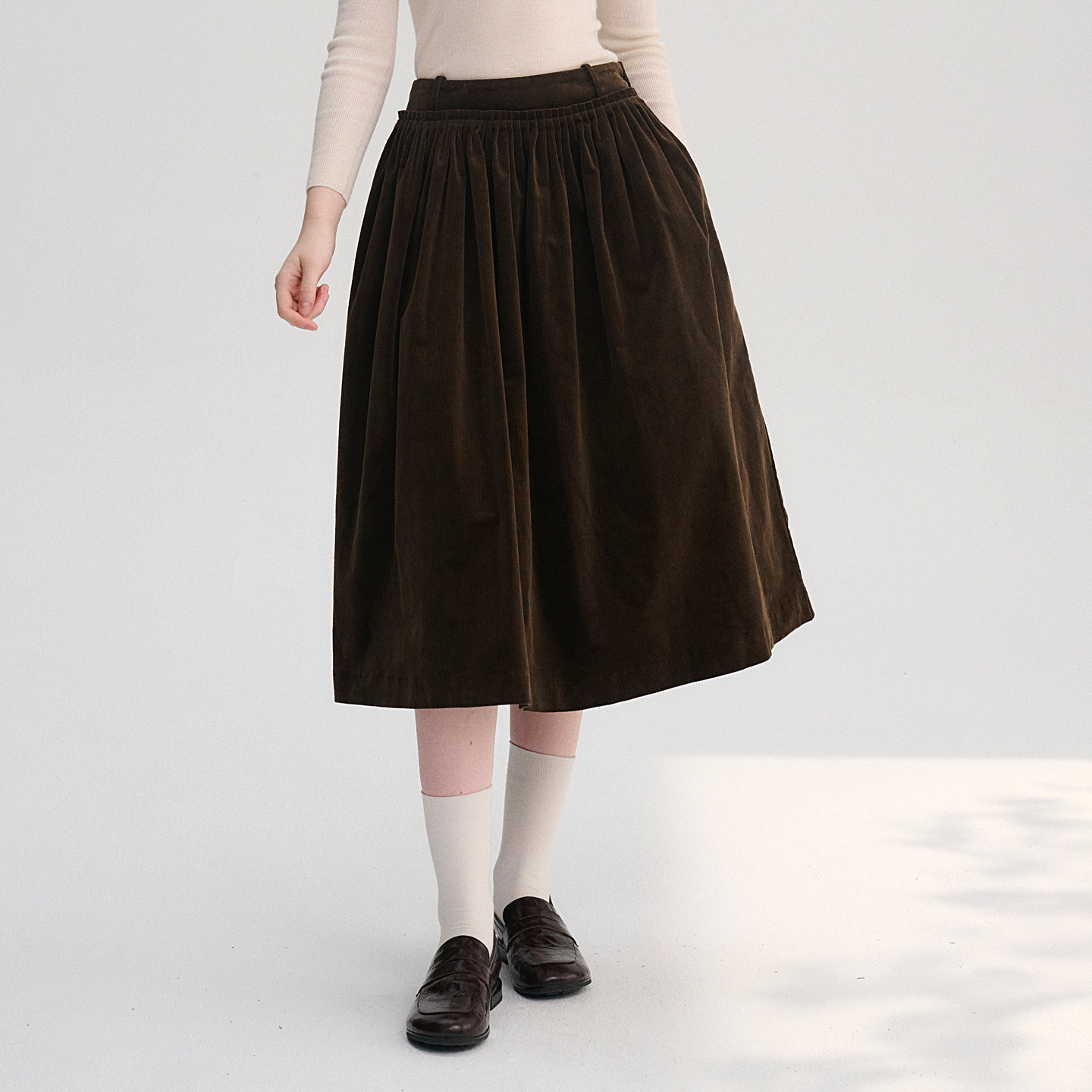 NHOO恩逅 褶皱设计感A字灯芯绒半身裙女秋冬新款棕色中长款裙子