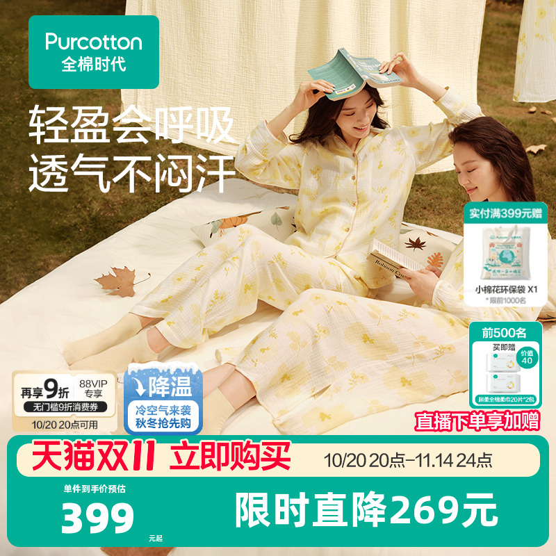 【代言人赵丽颖推荐】全棉时代睡衣女士褶皱纱家居服套装秋季纯棉