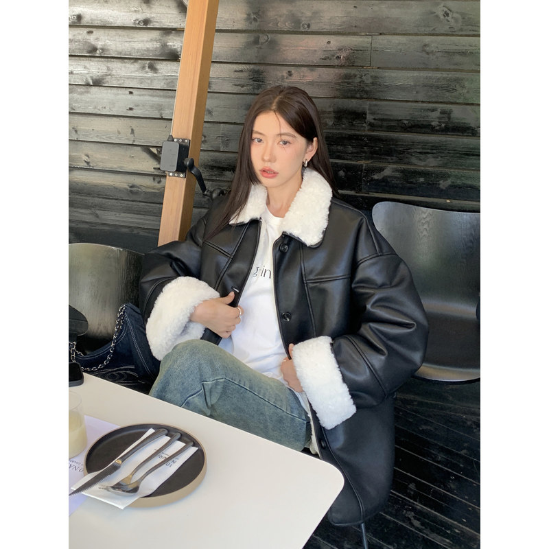 Halo Luu 黑色翻领加绒皮衣外套女秋冬新款宽松高级感中长款夹克