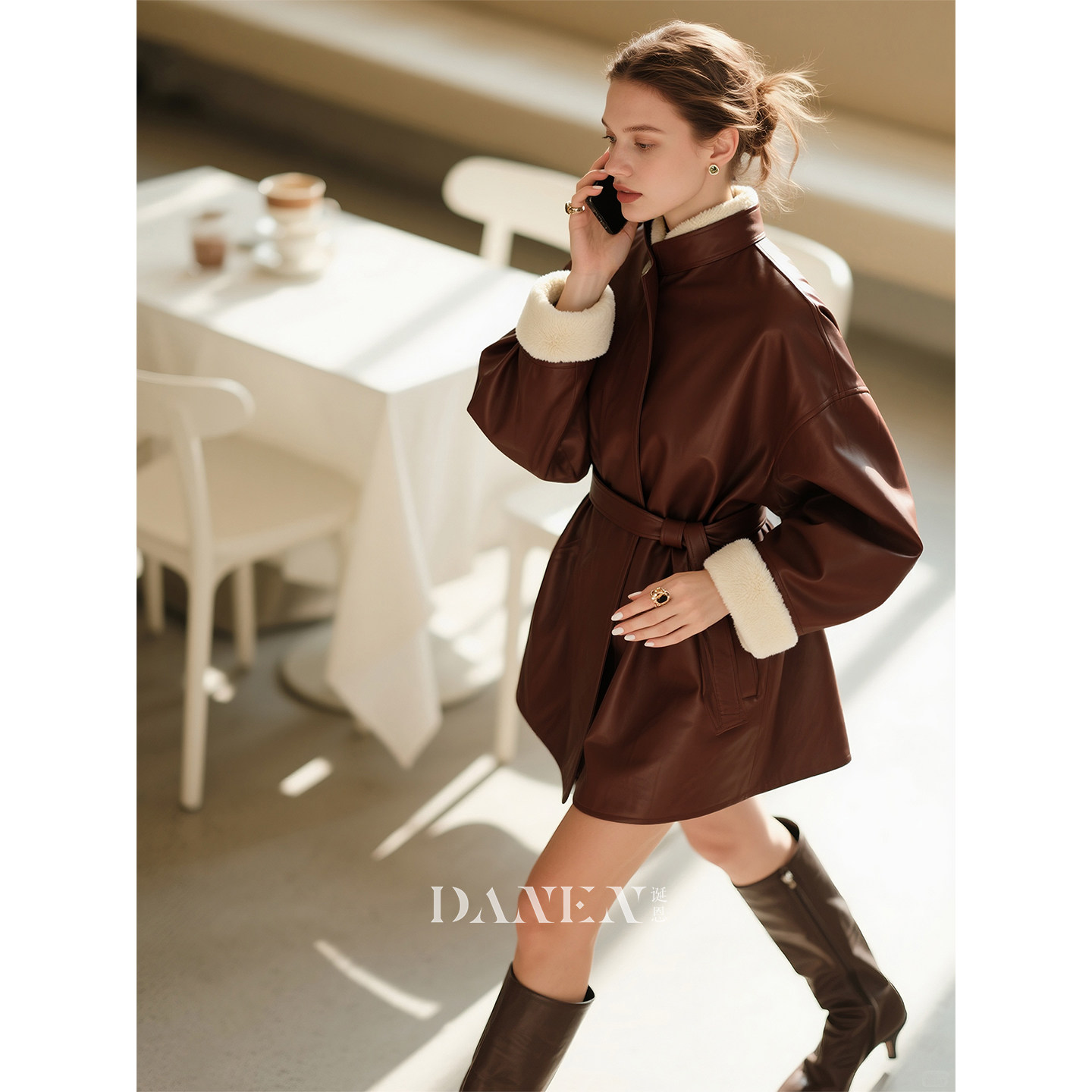 安可拉红收腰立领加绒皮衣外套女2026年秋冬新款港风小个子外套
