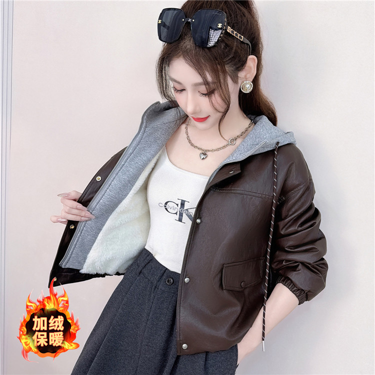 加绒皮衣外套女冬季新款美拉德宽松休闲落肩袖可脱卸帽短款皮夹克