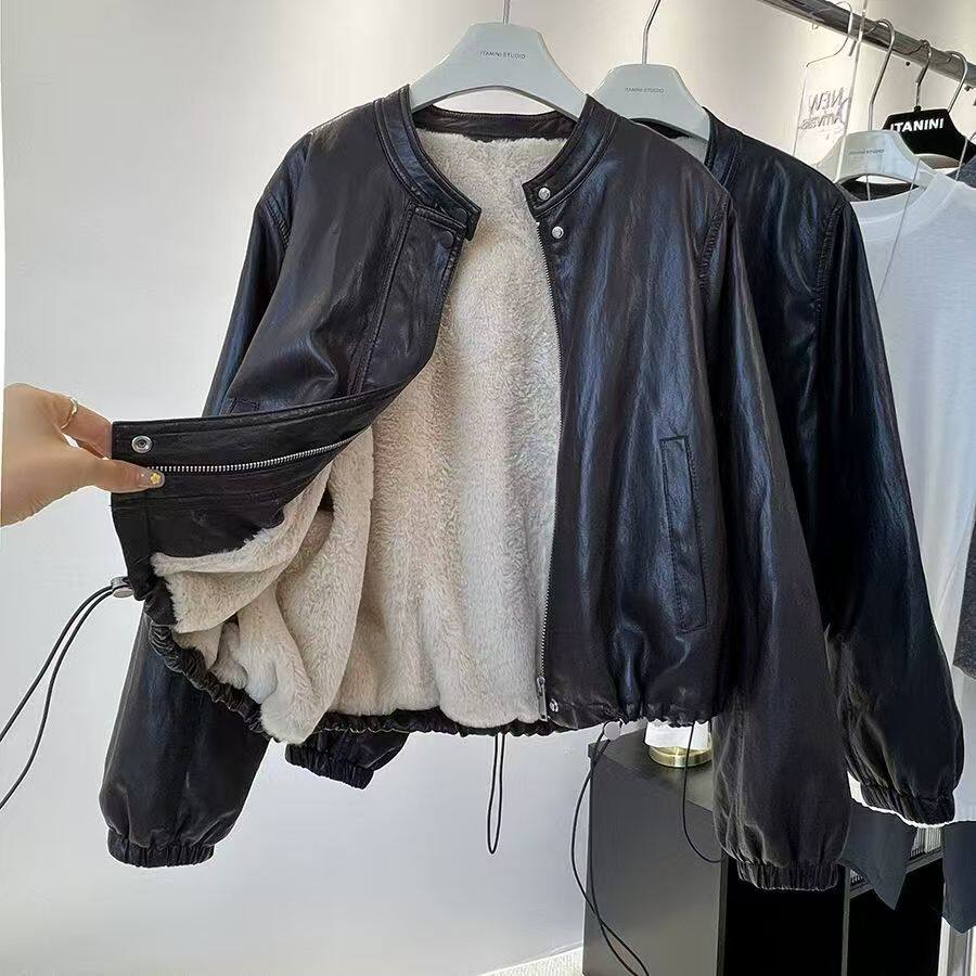 韩系加绒皮衣外套女短款2025冬季新款立领显瘦皮夹克时尚百搭上衣