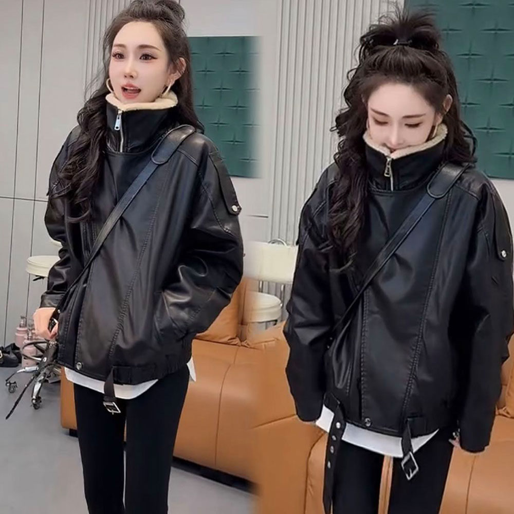 加绒皮衣外套女短款2025年新款冬季时尚宽松小个子加厚皮夹克棉服