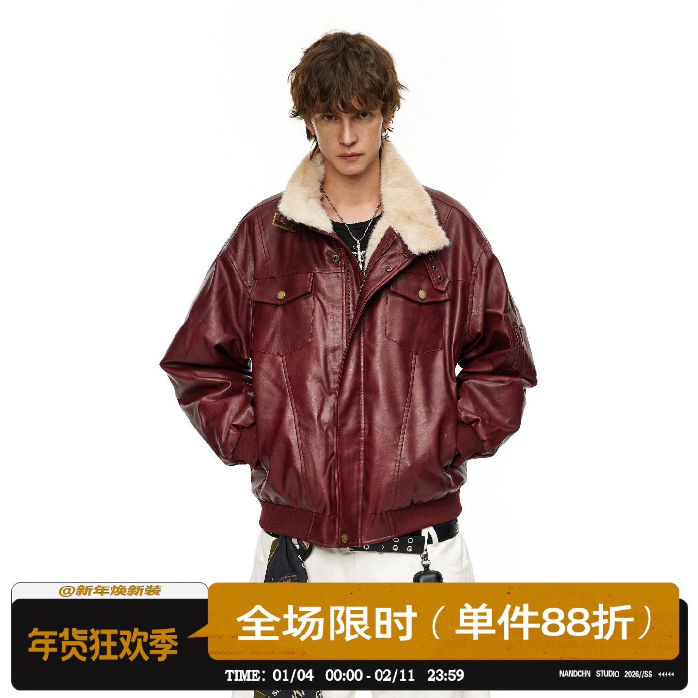 【郑合惠子同款】易碎商店双倍保暖加绒皮衣外套复古做旧擦色套装