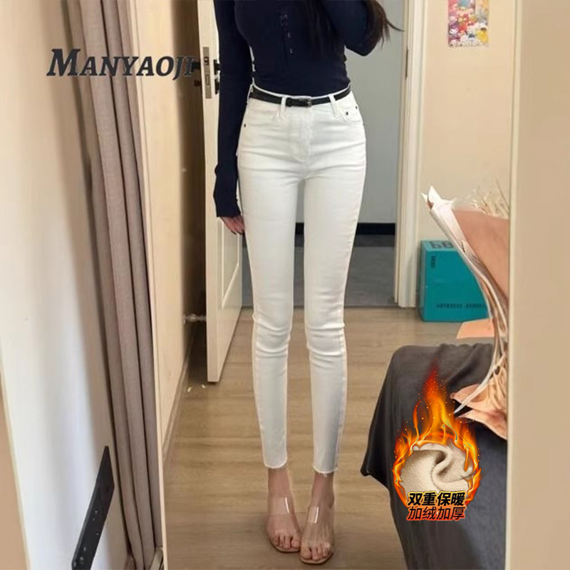 高腰白色牛仔裤女2025年秋冬加绒新款显瘦修身紧身小脚铅笔裤子