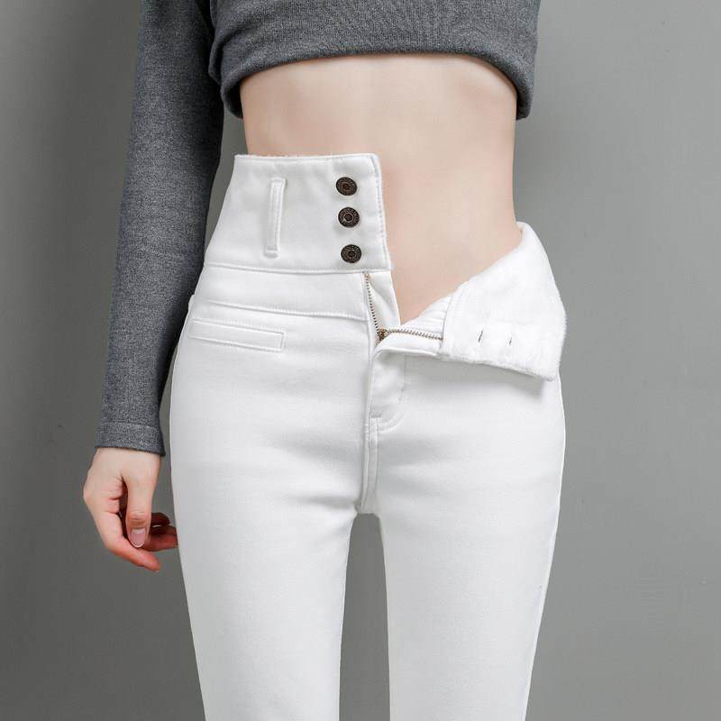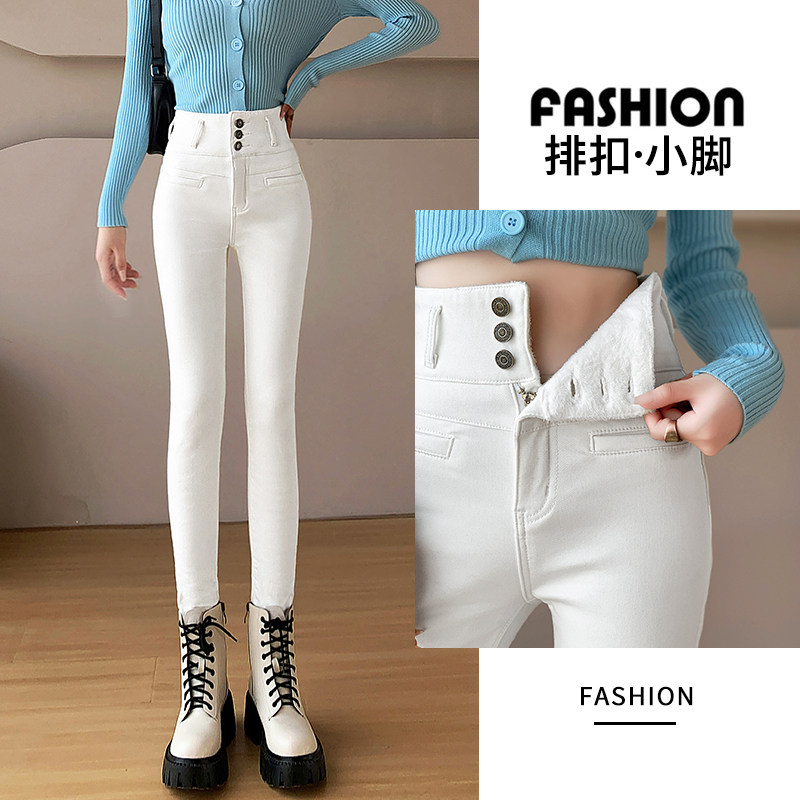 白色加绒牛仔裤女秋冬季高腰收腹排扣小脚裤紧身显瘦加厚铅笔裤棉
