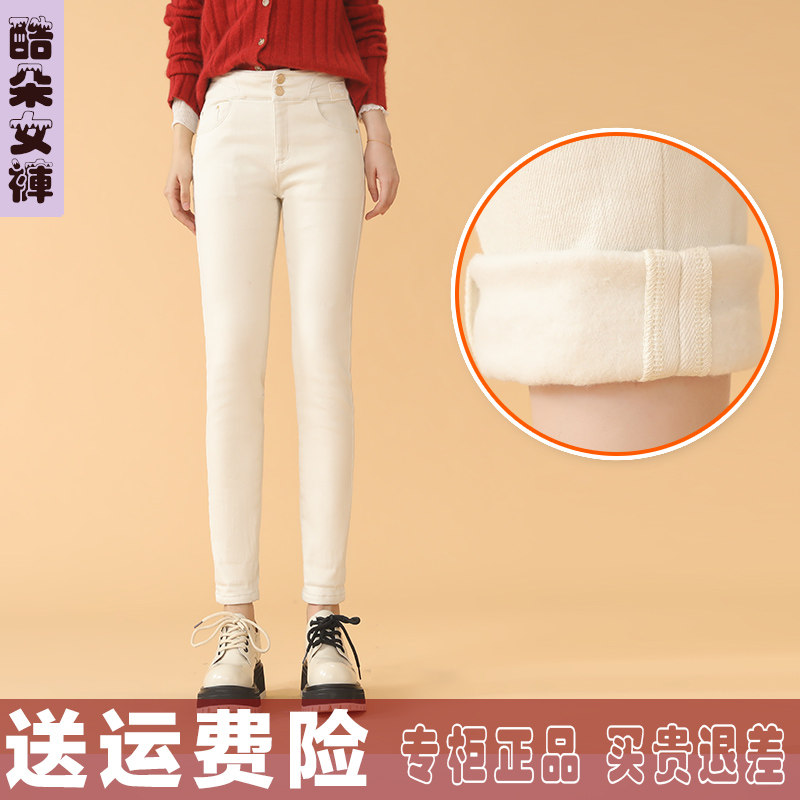 酷朵磨毛加厚白色牛仔铅笔裤女2023冬新款22Q8323 高弹小脚裤梅鸿