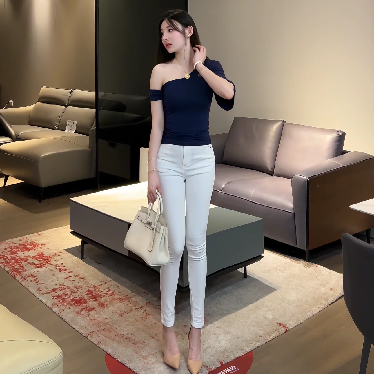 2025秋季新款腰头斜扣白色小脚牛仔裤韩版高腰弹力紧身九分铅笔裤