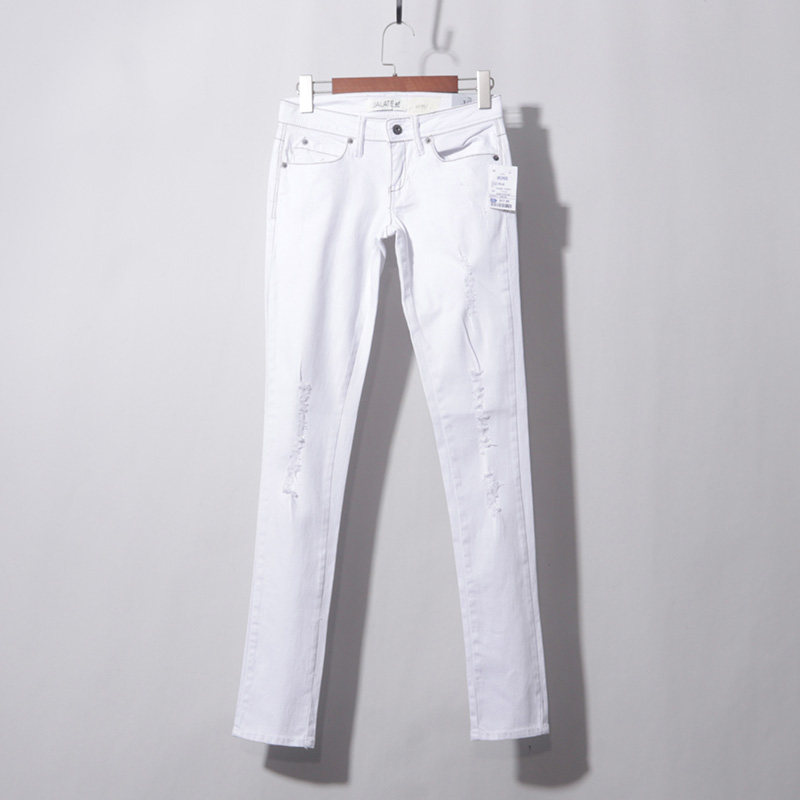 低腰白色明线磨破小脚秋季磨破牛仔裤女弹力修身小脚铅笔裤女长裤