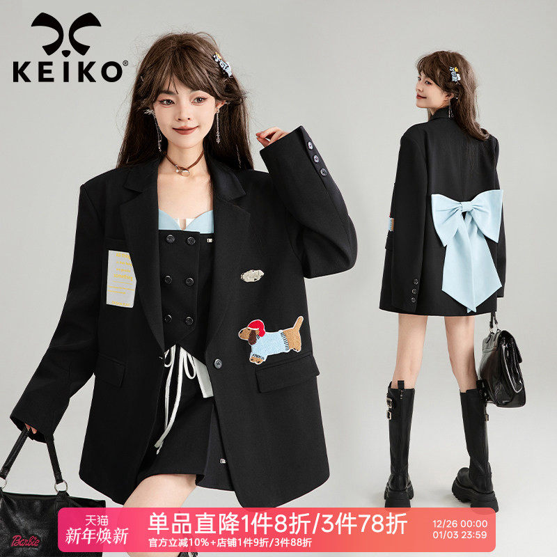 KEIKO 设计感贴布休闲西装外套女25秋季小西服+背心+休闲裤三件套