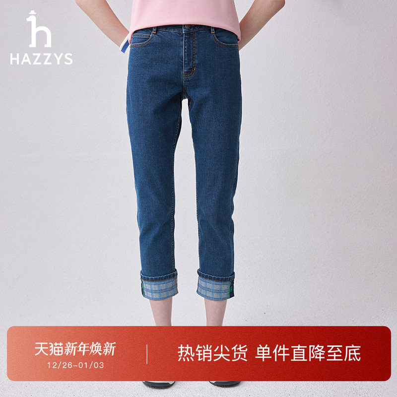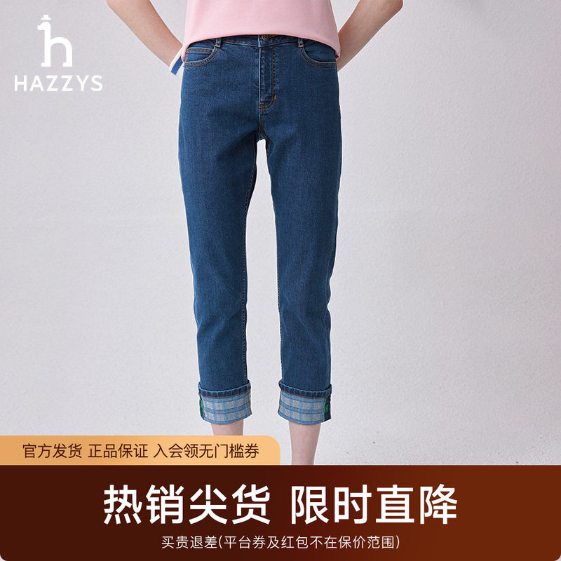 【专柜正品】Hazzys哈吉斯直筒翻边牛仔裤女春季休闲九分裤